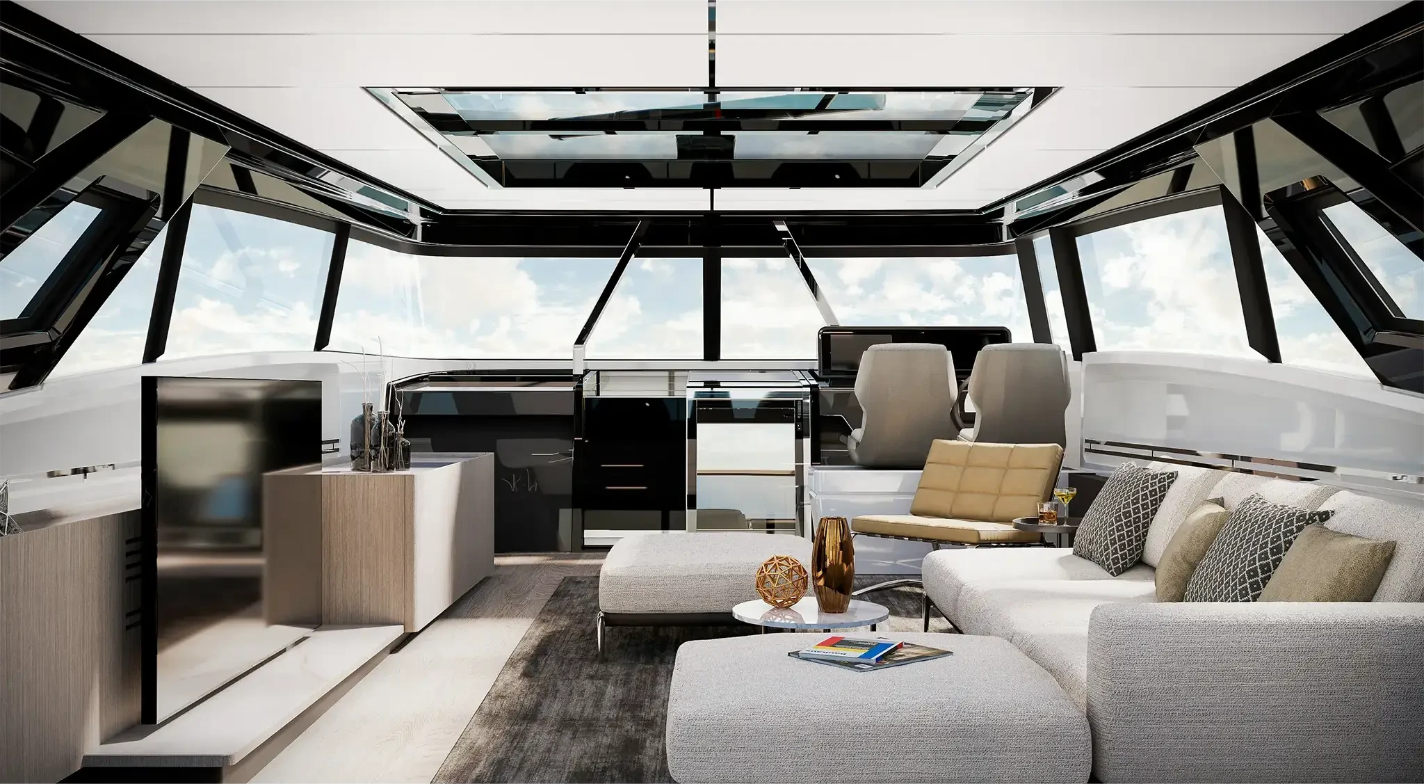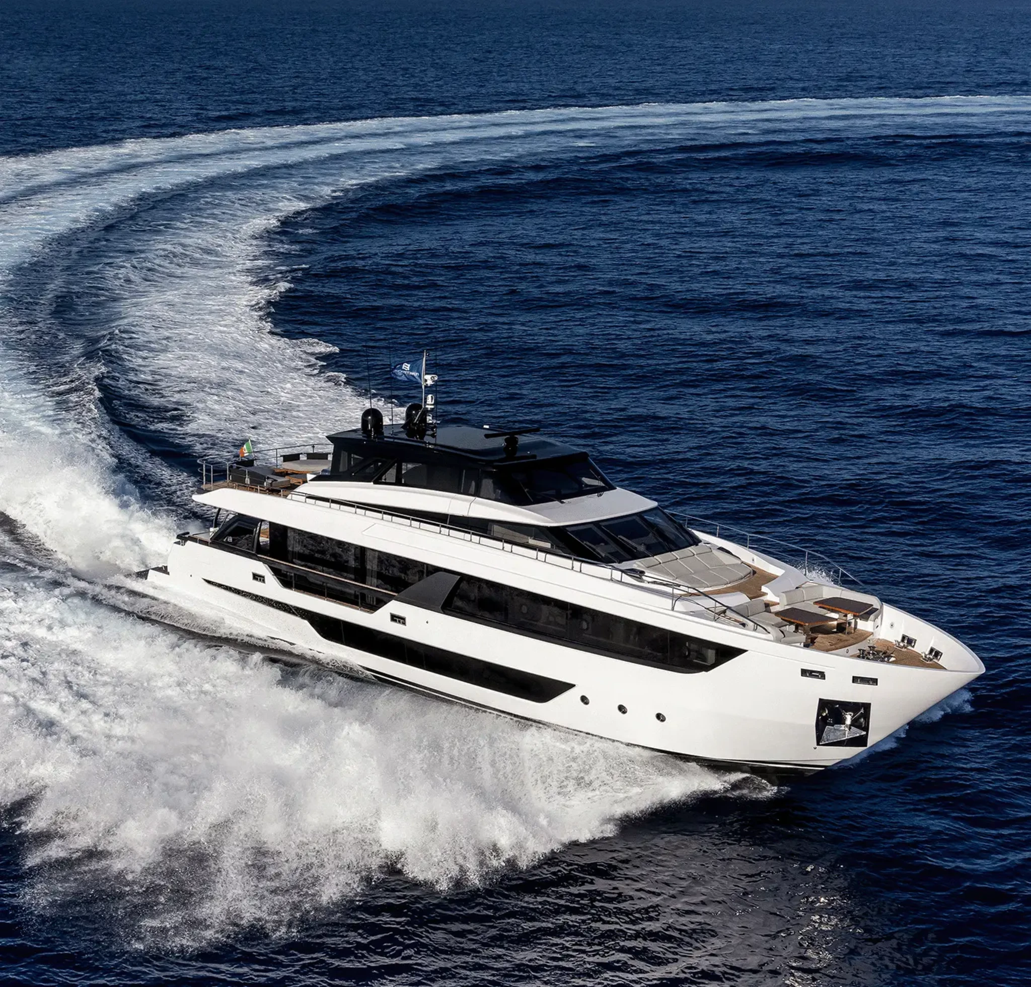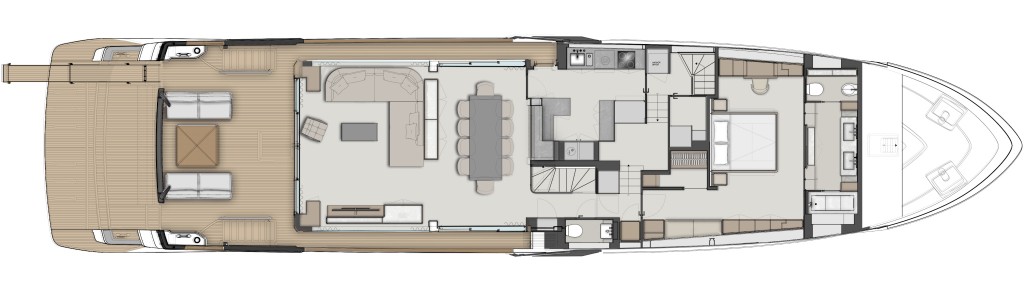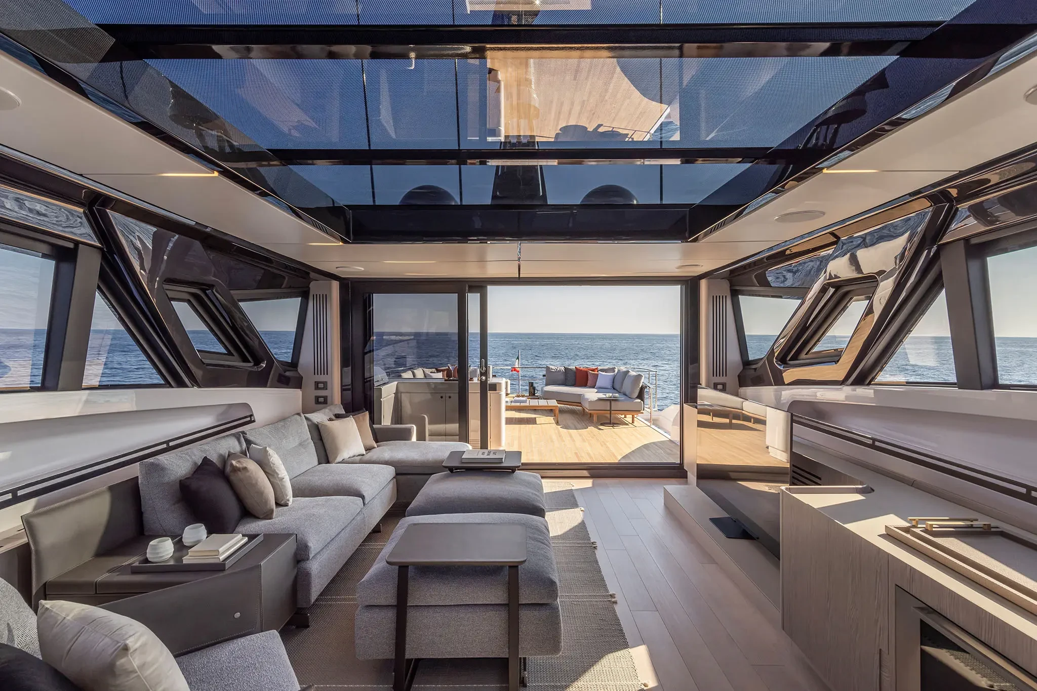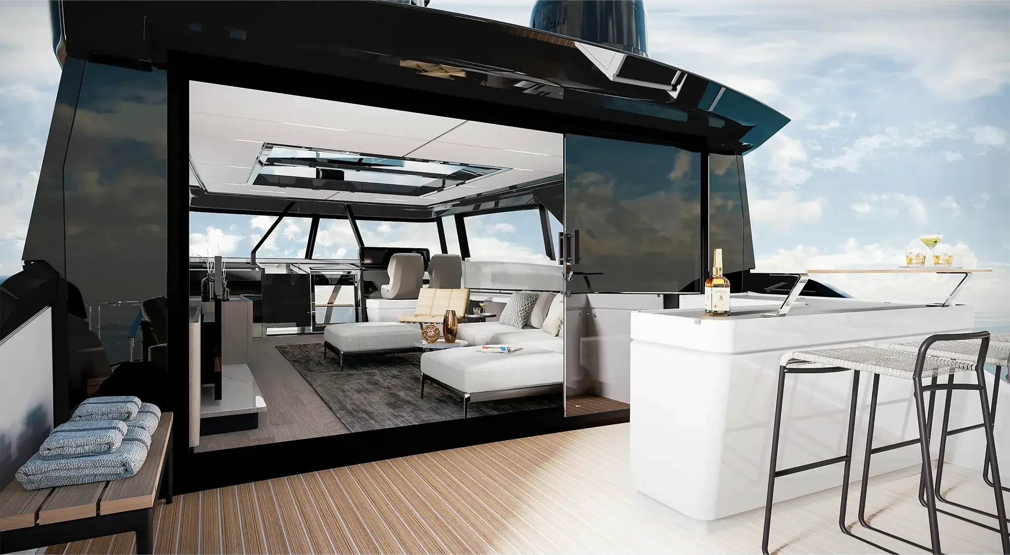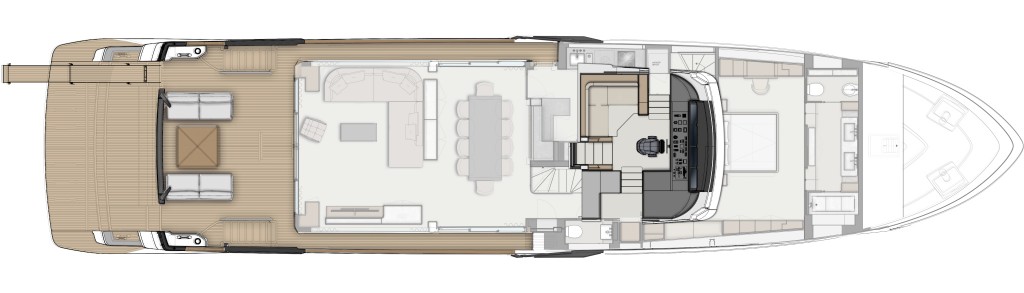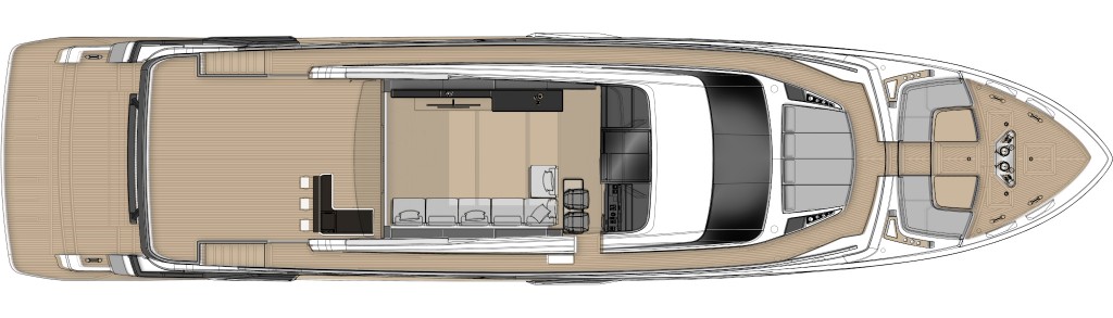The Skydeck edition of Ferretti Yachts 1000 features an upper deck redesigned to create an enclosed, sheltered space that can be enjoyed year-round and conveys the breathtaking feeling of being able to touch the sky.