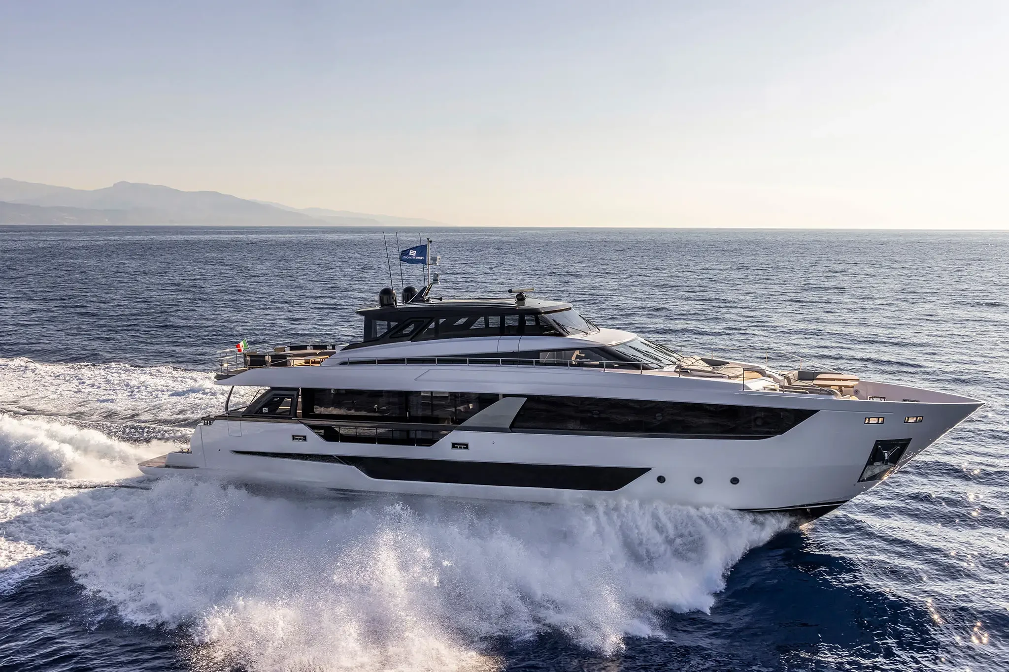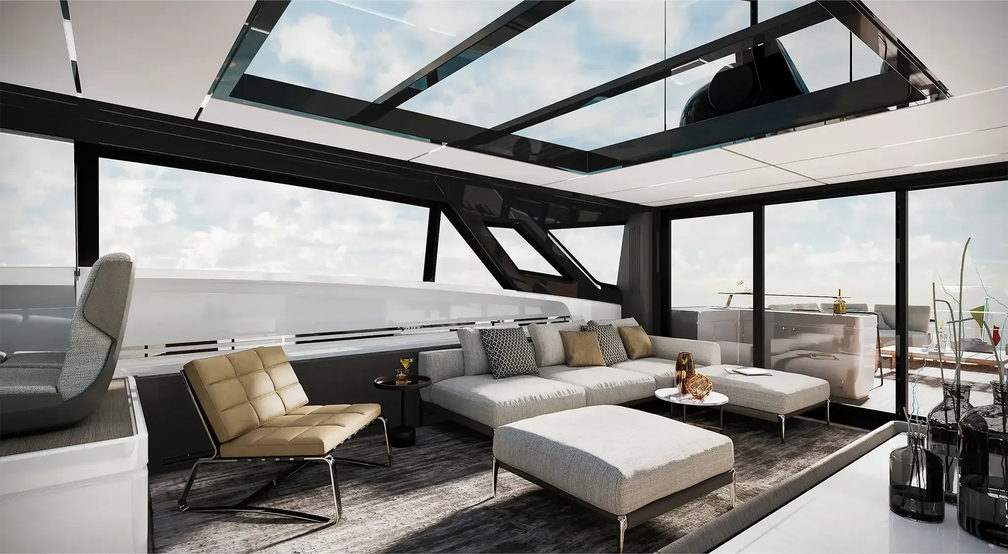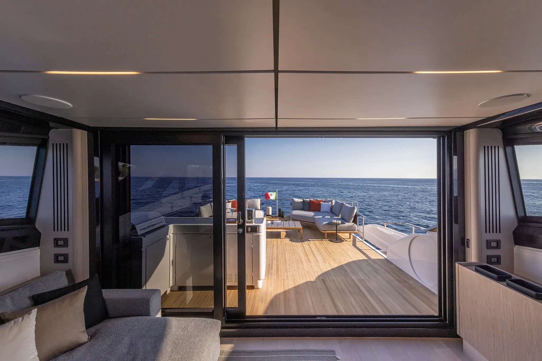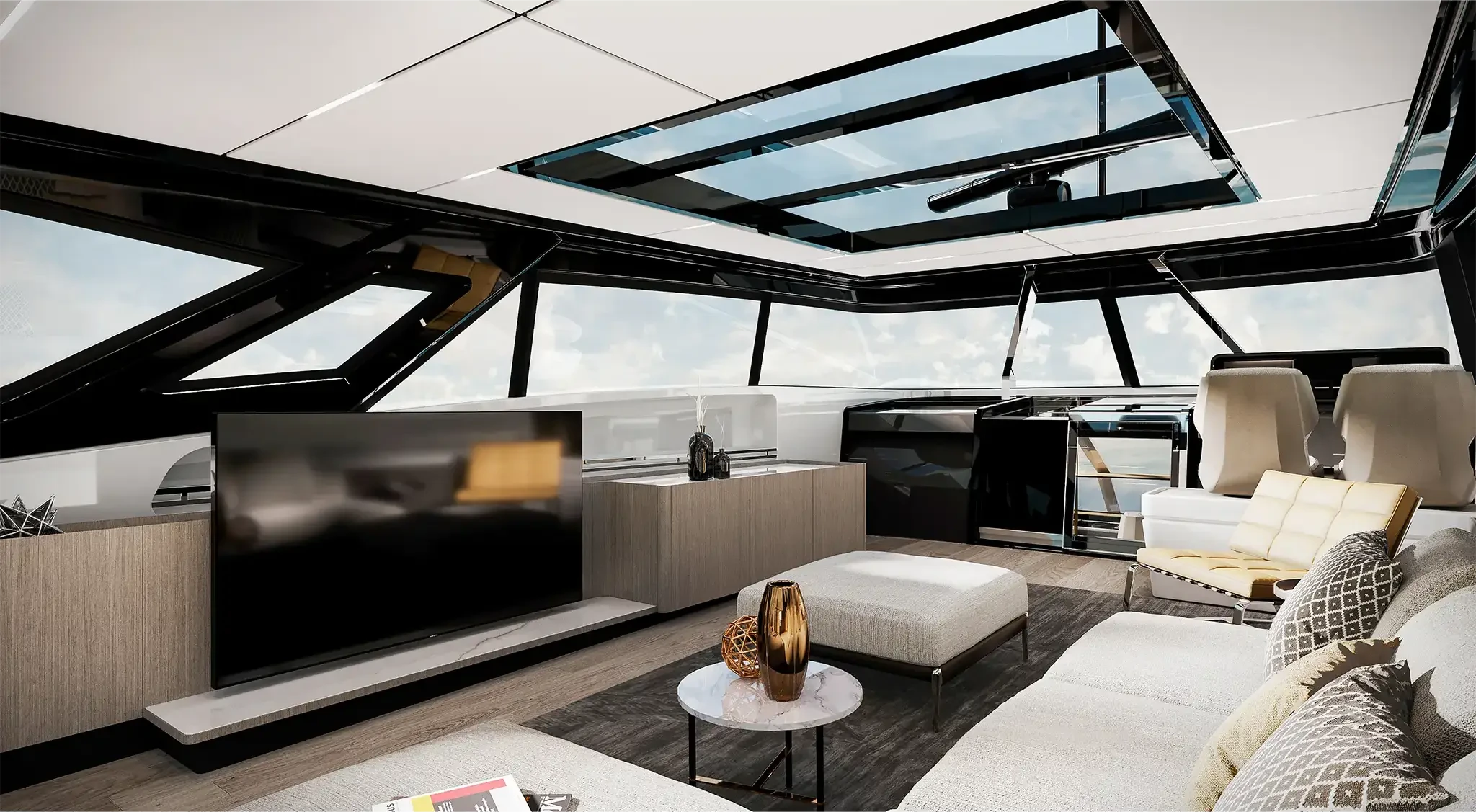 The Skydeck edition of Ferretti Yachts 1000 features an upper deck redesigned to create an enclosed, sheltered space that can be enjoyed year-round and conveys the breathtaking feeling of being able to touch the sky.