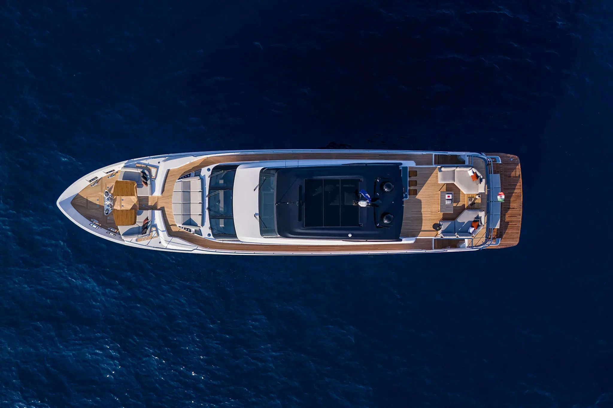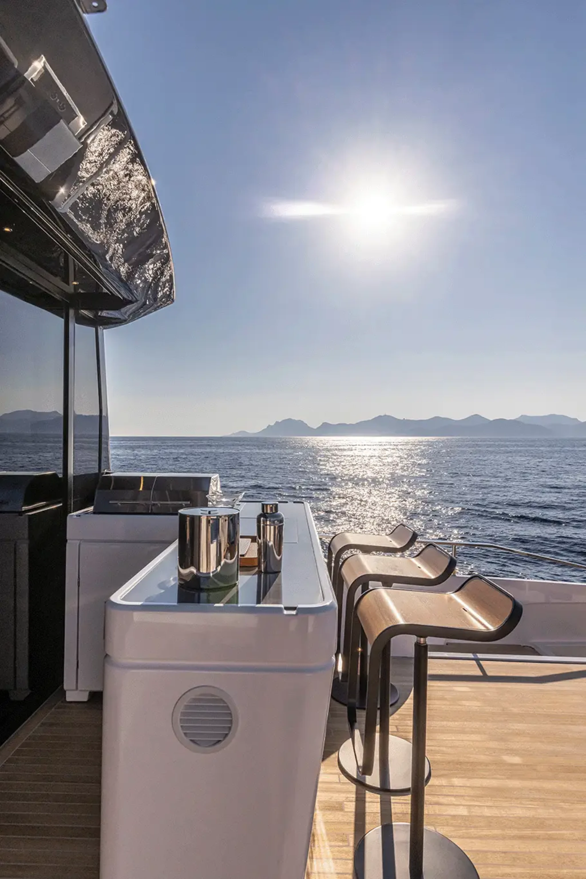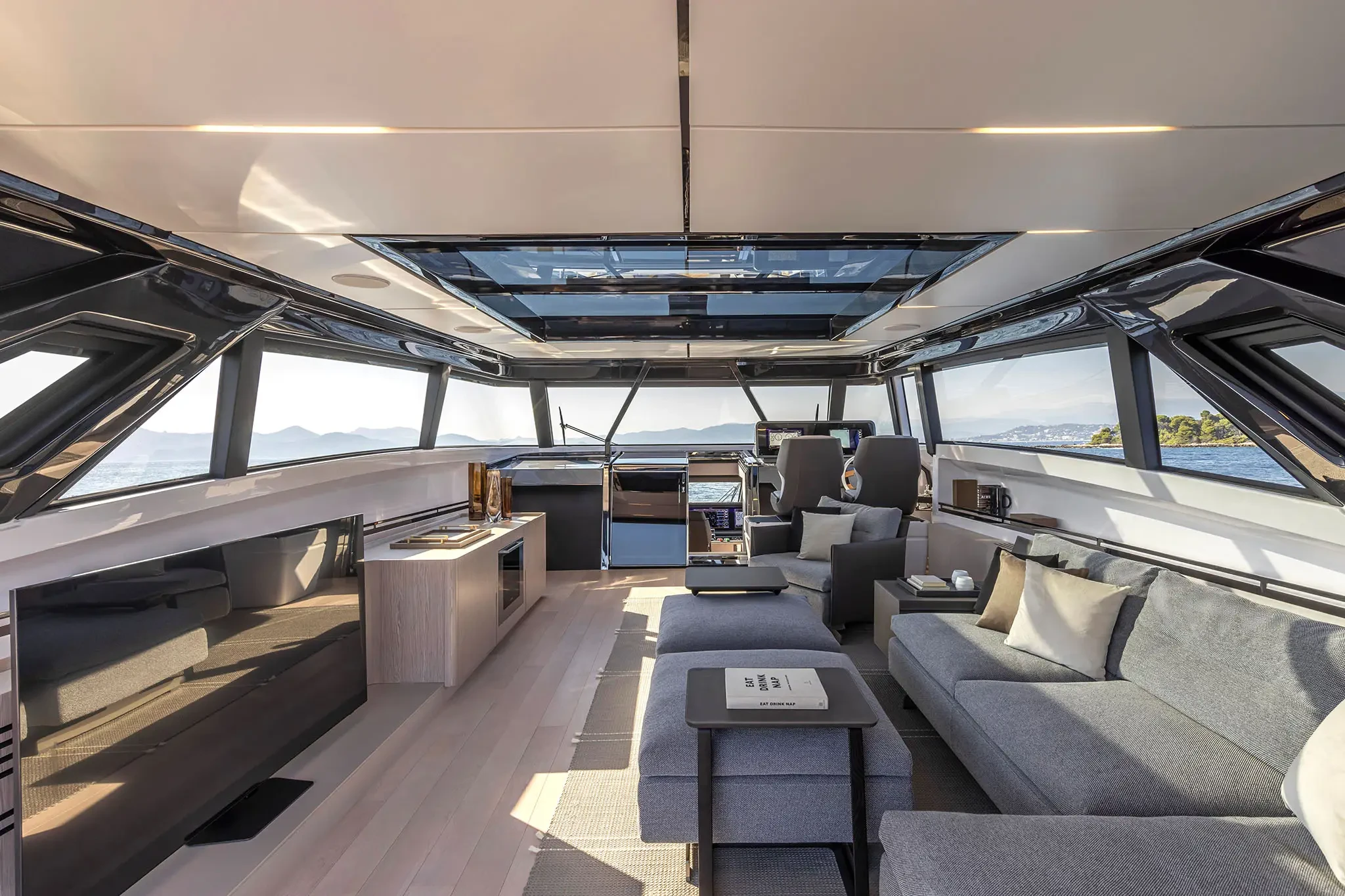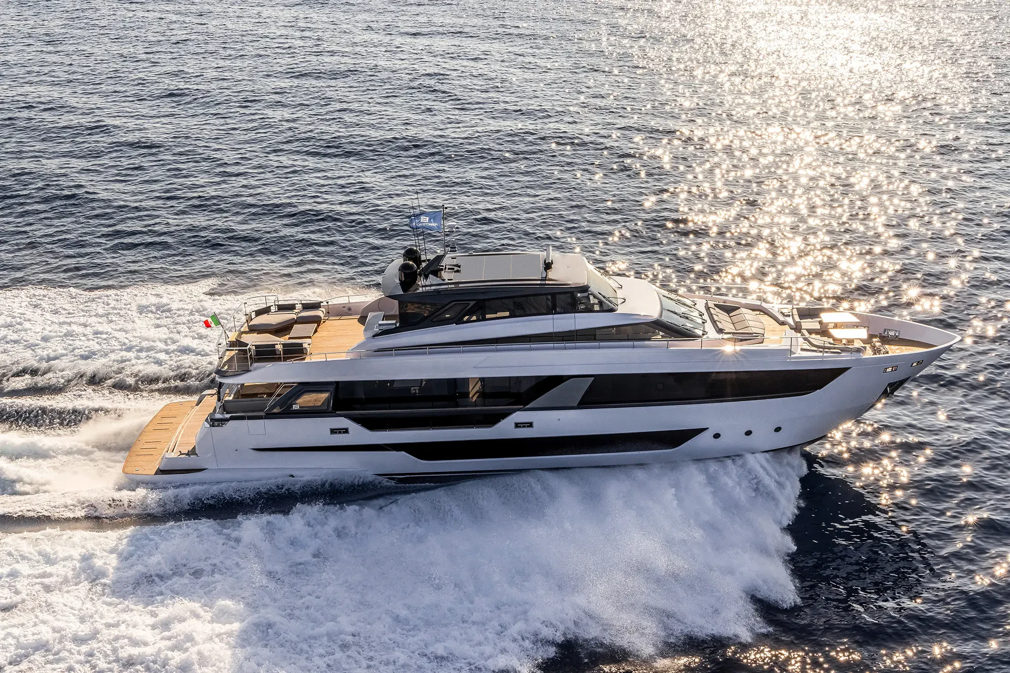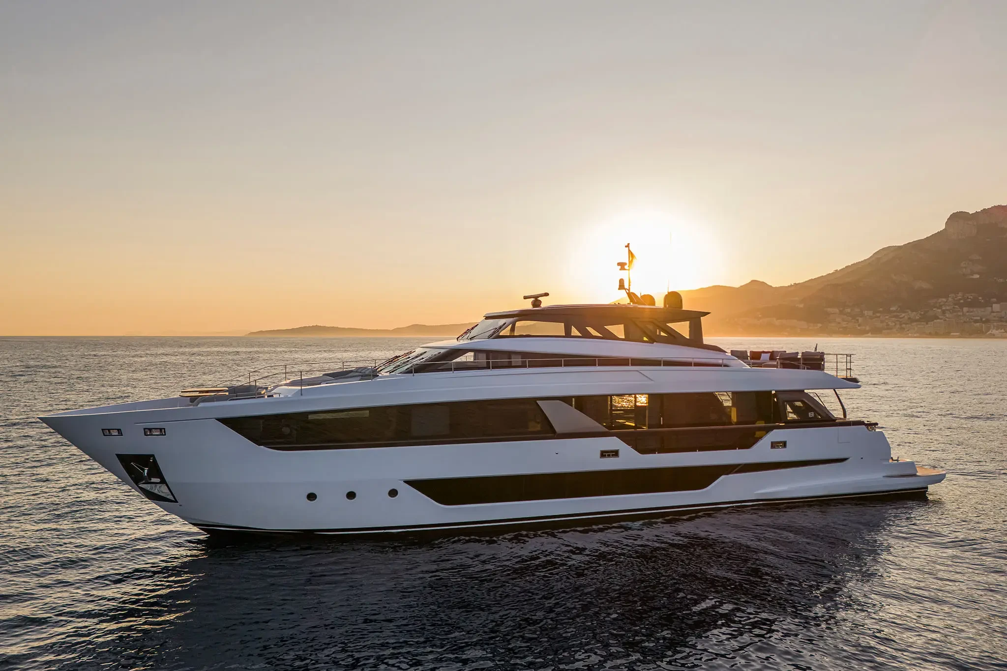 The Skydeck edition of Ferretti Yachts 1000 features an upper deck redesigned to create an enclosed, sheltered space that can be enjoyed year-round and conveys the breathtaking feeling of being able to touch the sky.